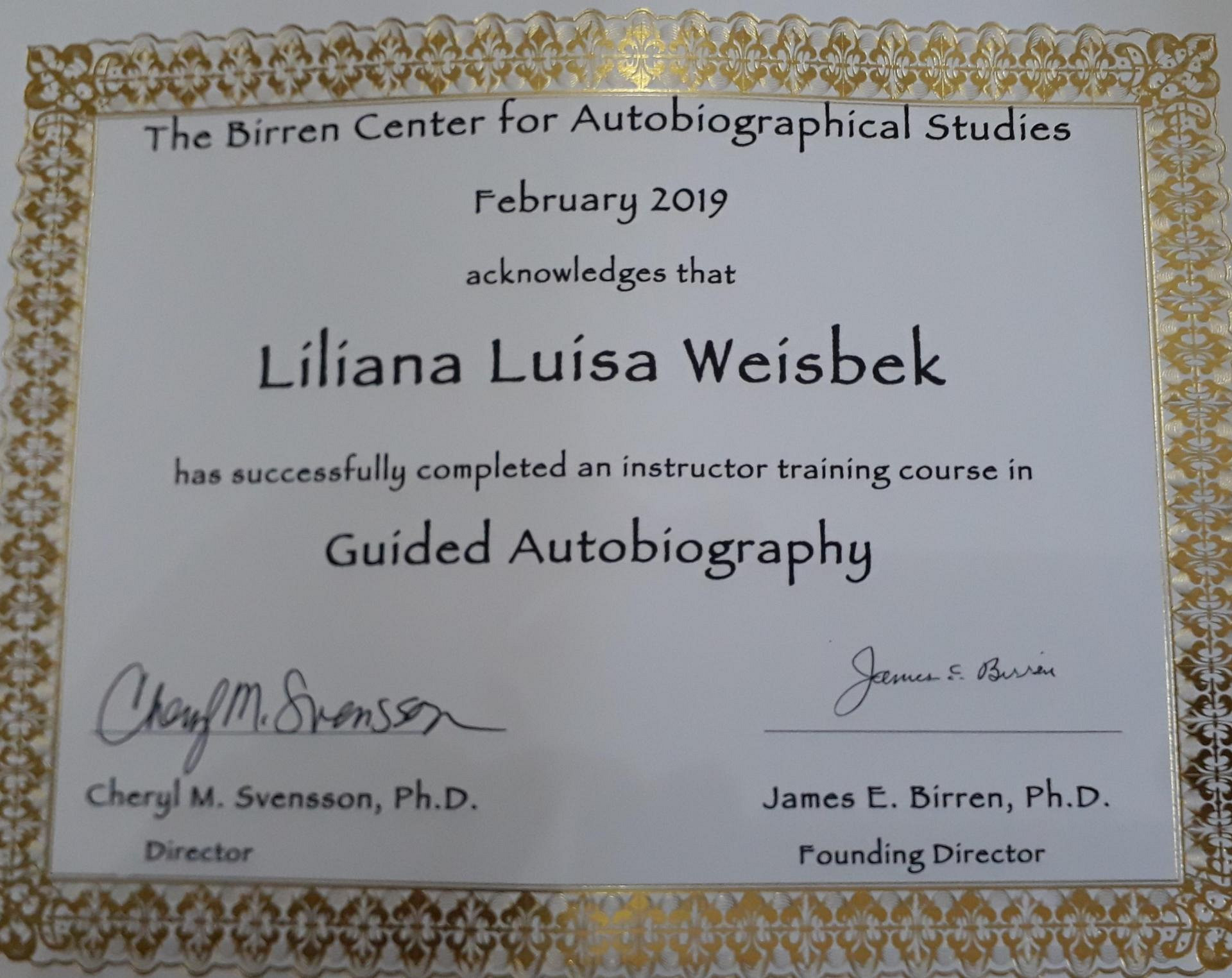 Soy Instructora Certificada de Autobiografía Guiada (GAB) del Centro Birren de California (guidedautobiography.com).